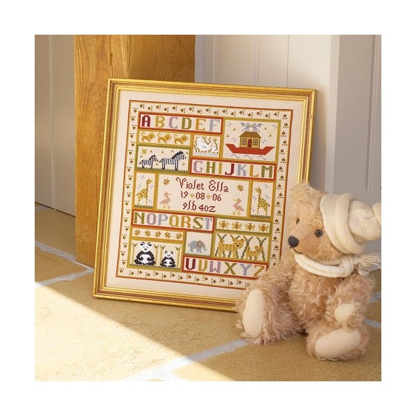 A jolly patchwork design featuring many popular animals and their offspring. The design also contains a large alphabet. This would suit either a boy or a girl beautifully and we supply enough thread to sew the personalisation in either red or blue.